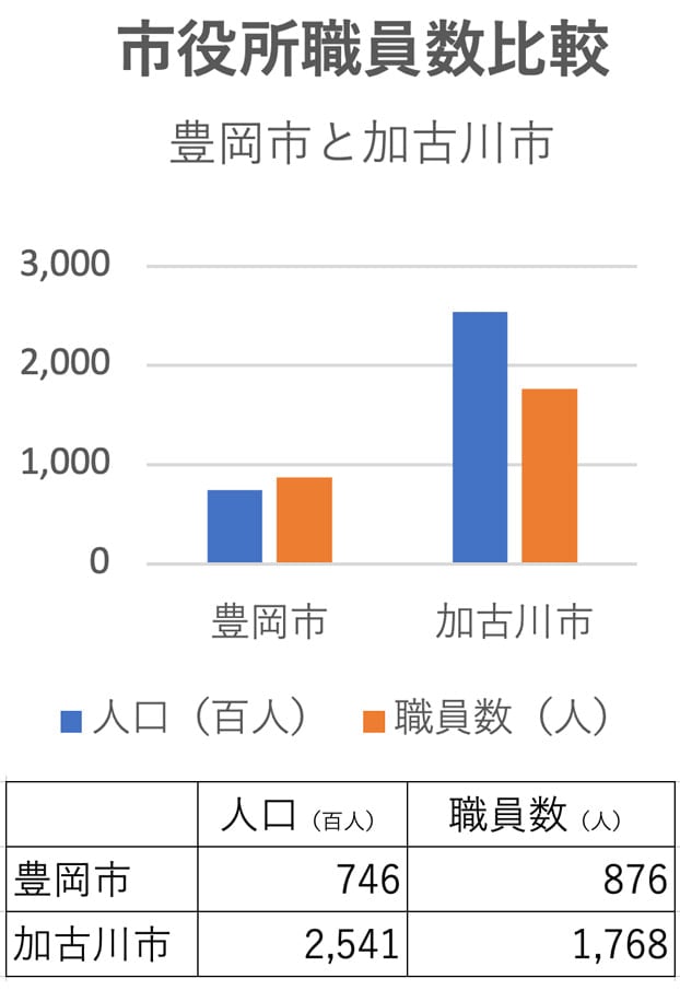 豊岡市は加古川市役所職員の1人の仕事を計算上は1.7人で対応している。この加古川市を基準にした計算であれば豊岡市の最適職員数は515人となる